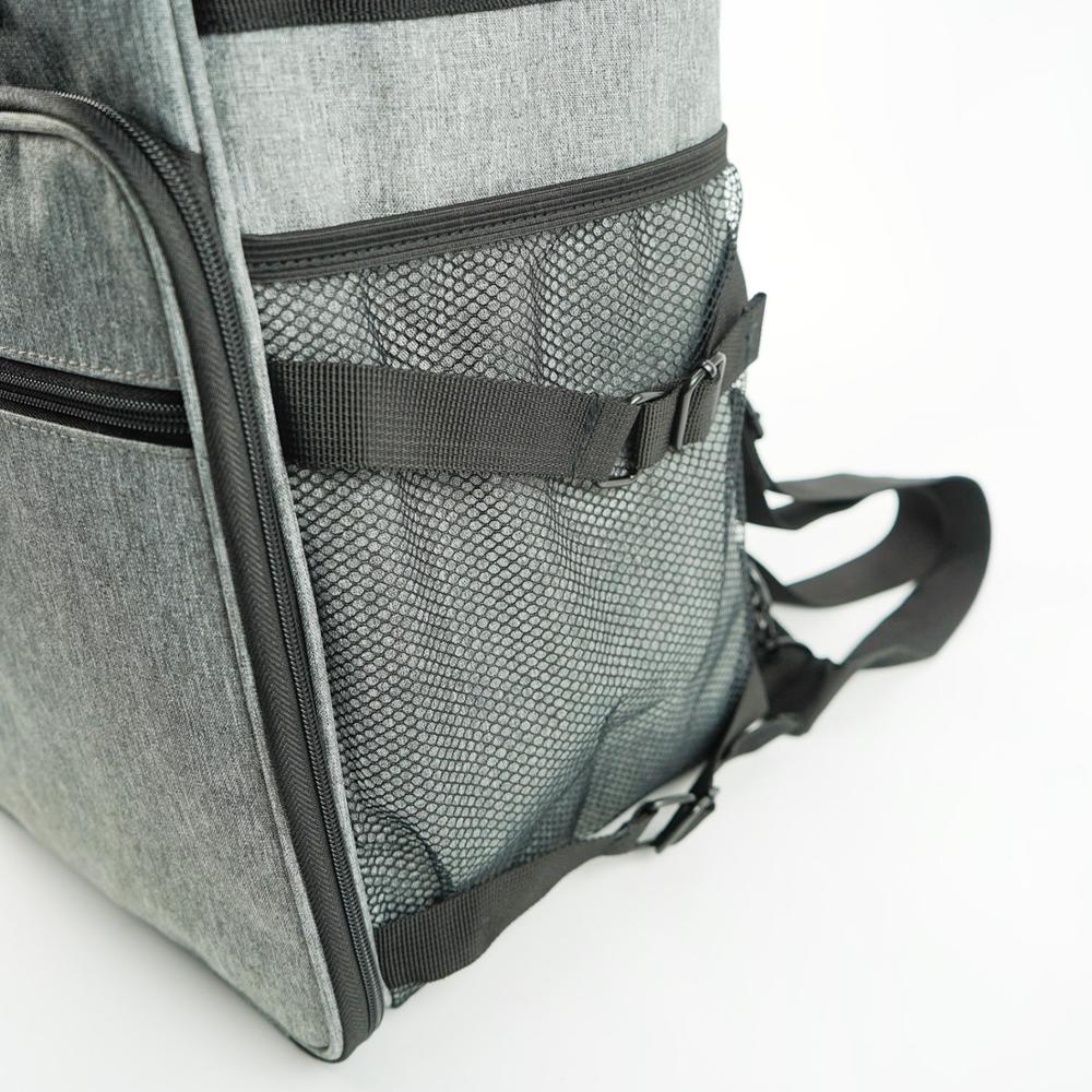A mala possui um bolso interno com zíper para o armazenamento seguro, além do compartimento principal, um bolso grande frontal, e uma necessaire secundária que pode ser acoplada a mala principal. O saco de armazenamento de alimentos mantém os alimentos frescos.